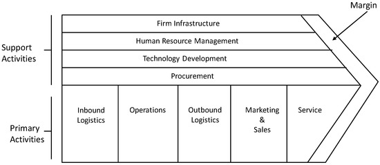 Porter’s Value-Chain concept (see Figure 2) is a view of how firms organize themselves to transfer and transform inputs in a way that infuses value-added utilities for customers [59]. Generally put, those activities of a firm most closely associated with adding utilities that the customer will find valuable are the primary activities of the value chain: inbound logistics, operations, outbound logistics, marketing and sales, and service. Alternatively, all remaining activities of a firm, which mainly serve to enable primary activities, are classified as secondary activities: firm infrastructure, human resource management, technology development, and procurement [60]. A variety of supply chain and logistic activities have been associated with components of the value chain, including IT connections [61,62], customer cost-versus-value estimates [63], and SCM strategies [64], among others.