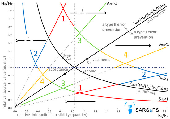 (b) The first resource n is scarce and is not accumulated: Skn < 1, Akn < 1 and the second resource k is enough but it is accumulated: Snk > 1, Ank > 1. In this case, it is the second resource that has to be accumulated due to the specific distribution in time of its supply. There is a shortage of the first resource but its supplies are stable, therefore, there is no real need for safety storage. The second resource is invested. Since its interactions with the sources of the first resource are scanty and frequent, there is no sense in investing in intensification of interaction with each one of them. In this case, it will be more beneficial to invest into the increase of their amount. In this case, the system will be adapting to the needs of a group of additional counterparts, i.e., to the system of a multitude of similar resource sources. However, part of this multitude will be subsequently included in the system concerned. As an example, we can consider accumulation of various goods for a larger number of customers, or employment of additional less-skilled workers in case the existing ones fail to manage. Such strategy of accumulation of the second resource is aimed at prevention of the type I error, which means avoiding omission of an important event or failure to receive a resource. All emerging additional sources of resources of the same type will be included in the exchange system at the expense of the accumulated resources. At the same time, investment of resources in their exchange is aimed at avoiding type II error. Investments are used to increase the frequency of interaction.