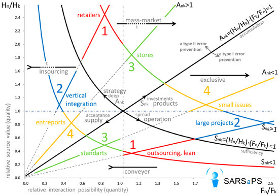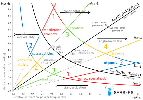 Other combinations will lead either to accumulation of both types of resources with both A > 1, or on the contrary, there will be no need to invest both of them with each A < 1. Another possibility will mean that there is no excessive resource with both S < 1, or that there are no scarce resources with both S > 1. In all four above-described cases the flow of resources through the system will be irrational, therefore there will be no interaction between the systems. Mathematically, in case of two resources n and k, assuming that Snk = (Hn/Hk)·(Fn/Fk) > 1, then Skn = (Hk/Hn)·(Fk/Fn) < 1 and with Ank = (Hn/Hk)·(Fk/Fn) < 1 then it will always be Akn = (Hk/Hn)·(Fn/Fk) > 1.