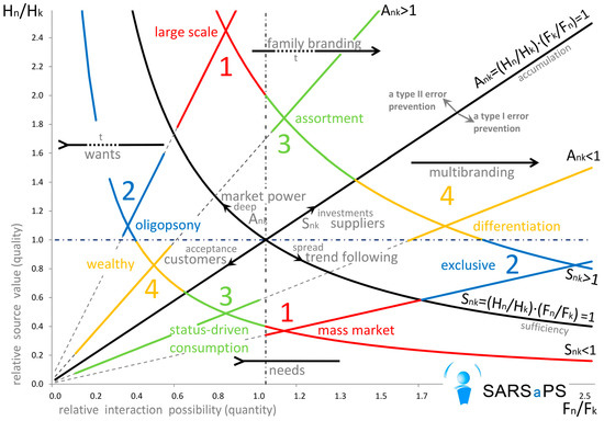 As it was shown above, there are two main ways to build the structure of any state social system: (а) preventing type I error in the investment of one of the resources formed when there are large and rare other resources and (b) preventing type II error in spending one of the resources formed when there are scarce but evenly distributed sources of the reciprocal resource [37]. Of course large systems cannot be fully uniform, as the resources are not distributed evenly inside them either. That is why all subsystems will have different strategies. As for the market subsystems, they form strategies depending on the relative value and frequency of the consumers interact with Figure 3. Of course, if most of the citizens have similar small income as is the case with centralized state systems, then consumers of most market organizations will have similar characteristics. The same can be applied to the opposite state systems.