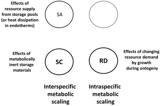 Schematic representation of the modal mechanisms used by Dynamic Energy Budget (DEB) theory to explain metabolic scaling [85,156]. Hypometric interspecific metabolic scaling (log-log slope < 1) is explained by surface area (SA) effects on resource supply from storage pools (or in endotherms by heat dissipation effects) and system composition (SC) effects involving disproportionate increases in metabolically inert storage materials with increasing body size. Intraspecific metabolic scaling results from ontogenetic changes in the resource demand (RD) of growth. DEB theory emphasizes SC and RD mechanisms, as indicated by larger code letters and thicker circular lines.
