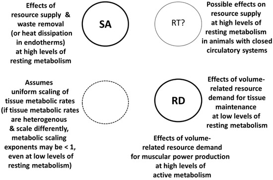 Schematic representation of the modal mechanisms used by the metabolic-level boundaries hypothesis (MLBH) to explain metabolic scaling both within and among species [19,46,56]. The relative influence of the component mechanisms depends on metabolic level. At high levels of resting metabolism, surface-area (SA) or resource-transport (RT) related effects on resource supply and waste (including heat) loss cause the metabolic scaling exponent to approach 2/3 or 3/4 in isomorphic organisms. However, at low levels of resting metabolism or high levels of active metabolism, volume-related tissue maintenance or muscular power production (RD effects) causes the exponent to approach 1 (assuming no heterogeneous scaling of tissue metabolic rates). If RT effects occur, they are restricted to organisms with closed circulatory systems (e.g., vertebrate animals). The MLBH emphasizes SA and RD mechanisms, as indicated by larger code letters and thicker circular lines.