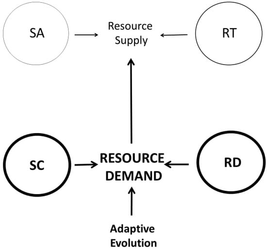 Schematic representation of Harrison’s demand-side model of metabolic scaling [106] within the framework of the CMT [20]. Thick arrows and outlined circles denote Harrison’s emphasis on the adaptive evolution of two modal mechanisms affecting resource demand. This model posits that the two modal mechanisms affecting resource supply evolve in response to changes in resource demand. SA = surface-area theory; RT = resource-transport theory; SC = system-composition theory; RD = resource-demand theory.