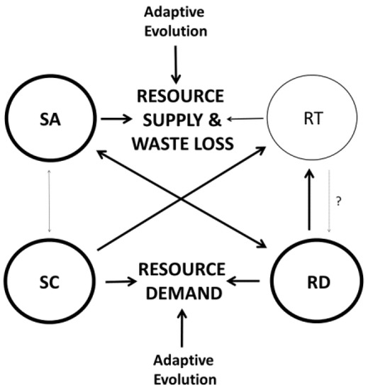Schematic representation of the relative importance of four modal mechanisms, and their interactions within the framework of the CMT [20] (cf. Figure 1). Thick arrows and outlined circles denote the modal mechanisms and their interactions that are most supported by current evidence, according to [20]. This model posits that metabolic scaling may evolve in relation to changes, not only in both resource supply and demand, but also in surface-area related loss of wastes (including heat). Source [20] provides further details about how metabolic scaling may respond to co-adjusted changes in both resource supply and demand, and to various physiological, developmental and ecological factors, both functionally and evolutionarily. SA = surface-area theory; RT = resource-transport theory; SC = system-composition theory; RD = resource-demand theory.