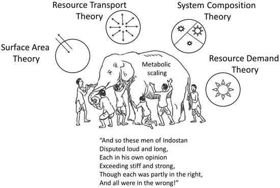 Most biological scaling studies have examined single kinds of allometric relations, and specific theoretical explanations for them, in isolation from others [19,51], thus creating a problem epitomized by John G. Saxe’s poem about the blind men attempting to understand an elephant by separately and independently examining its individual body parts [17] (Figure 7). When striving for a general theory of biological scaling, investigators should fully consider multiple hypotheses, mechanisms and kinds of scaling relationships, and their possible integration [17,20]. The frequently forgotten or underappreciated work of their predecessors can help light the way.