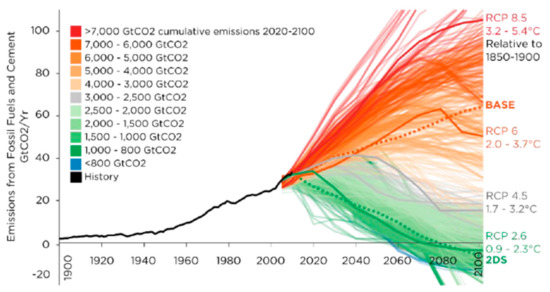 - The reference scenario (BASE) generated in the ETSAP project refers to the calibration year of 2005, describes the development of the global energy system in agreement with all other valid policies (including the nuclear phase out where it has been decided), and provides a baseline for comparing policy scenarios. The “BASE” scenario solves for least cost predicated on available resources and technologies under existing macroeconomic projections, which are consistent with the projections of the GEM-E3 [23] growth model. Total CO2 emissions related to energy and cement production are similar to the short-term reductions resulting from the National Determined Contributions (NDCs) and follow the pathways of the Representative Concentration Pathways (RCP) 4.5 scenario up to 2030 (Figure 1). The BASE case economic projection does not take into account environmental damage costs to ecosystem services in the global economy due to climate change or health and other damages related to local atmospheric pollutants (LAP).