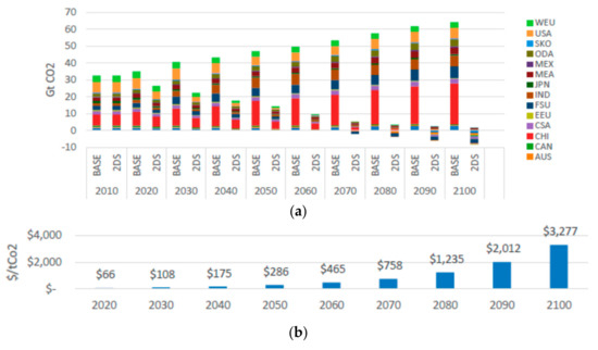 (a) Regional emissions for BASE and 2DS scenarios; (b) Undiscounted shadow prices for the 2DS mitigation scenario.