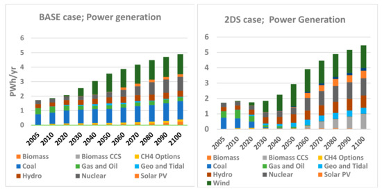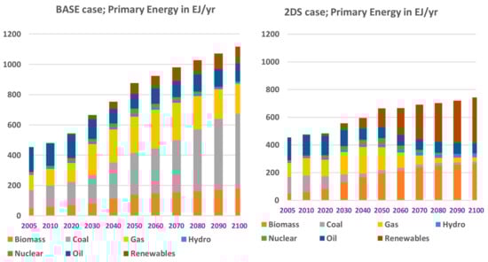 Primary energy consumption (Figure 3) in the BASE case increases from 544 EJ in 2020 to 924 and 1118 EJ/year by 2060 and 2100, respectively. Significant also is the reduction of Primary energy in the 2DS case, which attains levels of around 483, 665, and 743 EJ/year for the same periods. Most important is the fuel substitution that takes place in the 2DS case, where the carbon constraint shifts production to renewables, biomass, and nuclear while it limits the use of oil and gas.