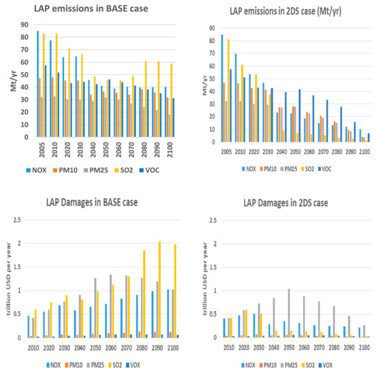 Local atmospheric pollutant (LAP) emissions and damages (external costs) estimated ex-post for the BASE and the 2DS cases. NOX = Nitrogen Oxides; PM = Particulate Matter; VOX = Volatile Organic Compounds.