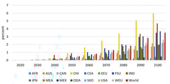 Furthermore, there are primary benefits due to the reduction of market and non-market damages of climate change. These damages can be identified ex-post based on the same relations that define damages in MERGE. For MERGE, market damages are proportional to temperature change while non-market damages depend on the willingness-to-pay to mitigate climate change and are quadratic (or even higher) to post-industrial temperature change. This ex-post assessment of benefits is an alternative evaluation of a Cost and Benefit Analysis (CBA) for the imposed carbon quotas (but not a formal CBA that takes into account damages directly in the utility function of the model). Such formal CBA analysis is technically feasible with TIAM-MACRO, but the equilibrium emissions are expected to be far above those required for the 2DS scenario. The 2DS policy case reduces the risk of climate change associated with the reference development scenario, such as temperature change, sea level rise, and biodiversity. Putting together the cumulated primary and secondary benefits, we obtain the regional, global, and time-dependent development of benefits (Figure 6). In addition, the cumulative undiscounted net benefits (of the 2DS policy) are 1.97% of the cumulative GDP of the BASE case while the relative GDP losses of the mitigation policy are 5.15%. These benefits correspond by 1.04% to the primary benefits of climate policy and by 0.93% to ancillary co-benefits. As shown in Figure 7, China, India, Mexico, and the Former Soviet Union (FSU) benefit above the global average. This is due to the size of the countries and their high emissions in the BASE case.