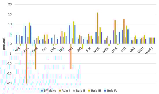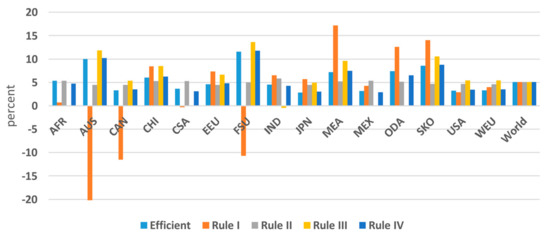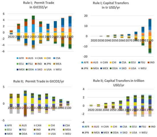 Burden sharing is a market-based mechanism to establish equity, as less-developed countries (LDCs) are not able to finance the transition to a carbon-free economy. However, a distribution of the initial endowment of their emission permits based on equity principles (rules) allows them to trade their emission surpluses and profit from trade. While the average global and undiscounted GDP loss is in the range of 5.15% cumulatively over the model horizon, there is considerable disparity in regional GDP losses in the least cost-efficient solution (Figure 7). For the Efficient solution, United States of America (USA), Japan (JPN), Canada (CAN), and Western Europe (WEU) have cumulative GDP losses of 2.9–3.3%, whereas the Former Soviet Union (FSU), China (CHI), Other Developing Asian Countries (ODA), India (IND), and Africa (AFR) have cumulative GDP losses between 3.7 and 11.6%. Figure 8 explains in detail the trade of permits across regions and the capital transfers for each rule. Rule I assumes equal emissions per capita (egalitarian) in 2050 after a period between 2020 and 2050 where a grandfathering rule applies. Regions such as Australia (highest profit), Canada, and the Former Soviet Union with a large biomass and renewable energy potential stand to gain significantly from this rule. The Middle East energy export countries suffer the largest economic losses relative to the Baseline as the world economy is decarbonized. In the long term, most of the emerging economies have GDP loss that is less in the efficient scenario as opposed to the equal emissions per capita scenario. China, Developing Asia, and India are seen to have unexpected larger economic losses as a result of high growth starting from a low economic level of high carbon intensity. Central and South America and Africa reduce their losses to above or near zero as a result of having slower growth than their emerging economy counterparts.