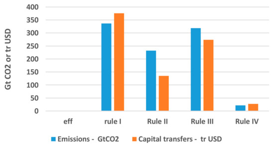 Figure 9 presents the integrals of capital transfers shown on the right-hand side (RHS) of Figure 8 for the different BS rules and the integrals of traded CO2 emissions on the left-hand side (LHS) of Figure 8. Notice also that the world GDP in 2100 is 314 trillion USD and the world CO2 emissions for the BASE case are 64.2 GtCO2 while the GDP integral from 2020 to 2100 is 14,272 trillion USD and the CO2 emissions 3785 GtCO2.