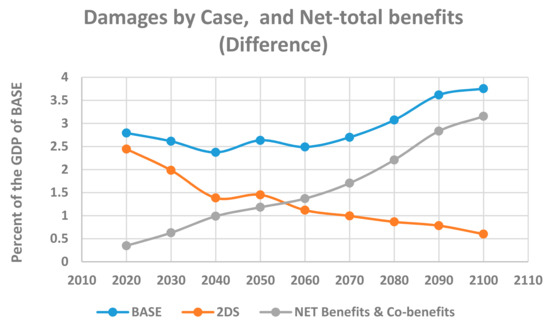 Benefits and co-benefits for the BASE and 2DS cases and the Net Benefits and Co-Benefits of the 2DS case relative to the GDP of the BASE case.