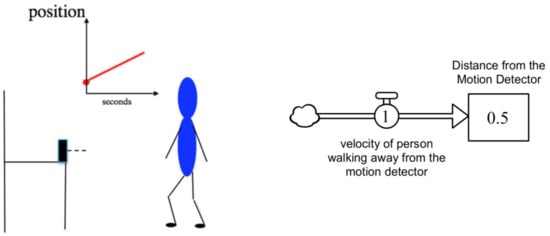 Student walking in front of a motion detector, and the SD model used to capture the idea of distance changing (linearly) over time. Assume the student initially stands 0.5 m away from the detector and then moves away from the detector at a velocity of 1 m per second for 4 s.
