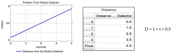 The graph and table produced by the SD software, and the equation for the situation described in Figure 3. In the equation, D represents the student’s current distance from the motion detector and t represents the time lapsed (in seconds) since the simulation commenced.