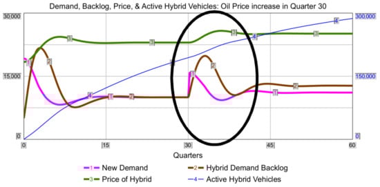 In the graph, you can see the result of activating an artificial increase in oil prices in quarter 30. Hybrid car demand increases in this quarter, then demand backlog increases, which increases the price of hybrid cars. Eventually, the demand is being met by the production and sale of hybrid cars and by people taking themselves out of the queue of customers for purchase of a hybrid car.