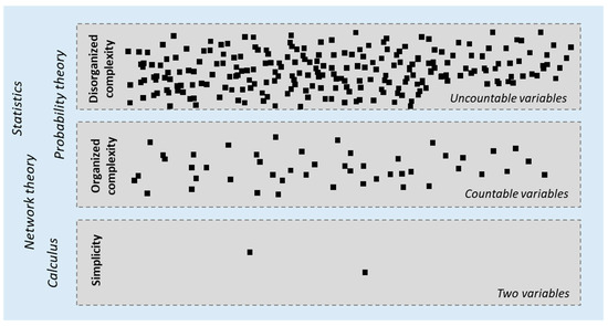 Complexity distributed in the three regions of simplicity, organized complexity, and disorganized complexity. An adaptation of the Weaver’s concept [6] and the applicable mathematical tools.