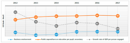 The Global Innovation Index [15] Brazilian rankings for business environment, public expenditure on education per pupil in the secondary level, and growth rate of GDP per person engaged, from 2012 to 2017.