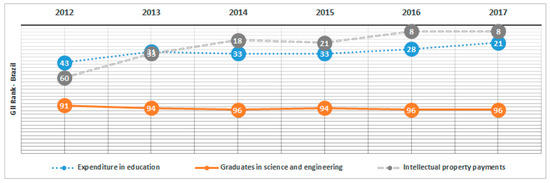 The Global Innovation Index [15] Brazilian ranking for intellectual property payments, graduates in science and engineering, and expenditure on education, from 2012 to 2017.