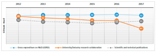 The Global Innovation Index [15] Brazilian ranking for gross expenditure in research and development, research collaboration between university and industry, and scientific and technical publications, from 2012 to 2017.