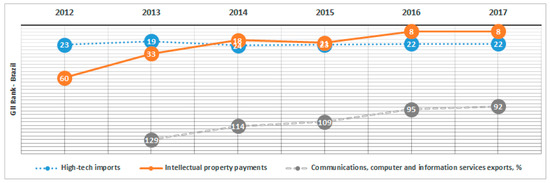 Looking to another aspect, the innovation index also shows some results regarding applied science and how the country relates to technology consumption. Figure 6 illustrates three indexes for intellectual property payments, high-tech imports, and technology services export. Intellectual property payments are the “charges for the use of intellectual property not included elsewhere payments (% of total trade) according to the Extended Balance of Payments Services Classification EBOPS 2010”, which is how much the country pays to use intellectual property from abroad. The high-tech imports’ indicator is given by “high-technology imports minus re-imports (% of total trade)”. Technology services export is the “telecommunications, computer and information services (% of total trade) according to the Extended Balance of Payments Services Classification EBOPS 2010” [15]. Companies and individuals from Brazil are intensive consumers of technology. From the companies’ points of view, technology is bought to be resold inside the country or to use in their internal processes. From the individuals’ points of view, it is a way to be up-to-date with several gadgets, from mobile phones to game stations and from television devices to social networks. In the same way that it imports high-tech products, the country is also a great importer of knowledge (paying for intellectual property). Both movements are dependent on the elements not on public policies, and this implies in a heavy dependency on external knowledge and technology—that is, low level of internal innovation combined with the weakness of research (as shown in the previous charts). Even regarding the export of services related to telecommunications, computer, and information, an index that is increasing slightly each year, the ranking position is poor.