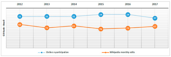 The Global Innovation Index [15] Brazilian ranking for online e-participation and Wikipedia edits, from 2012 to 2017.