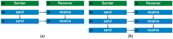 Pre-loaded MP model Example01_simple_message_flow scenarios from (a) scope 2, showing the scenario containing the new maximum of two iterations of send and receive (trace 3); (b) scope 3, showing the scenario containing the new maximum of three iterations of send and receive (trace 4).