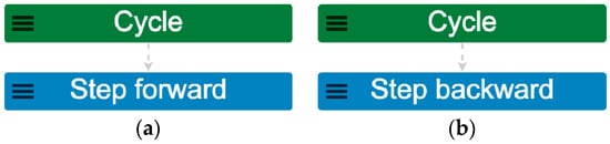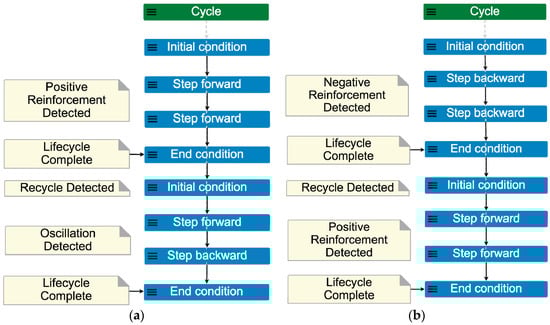 Initial event trace outputs of the Cycle_ISP_v1 model, run for scope 1: (a) Cycle steps forward; (b) Cycle steps backward. Neither scenario contains any repetition and therefore only represents part of a cycle’s behavior.