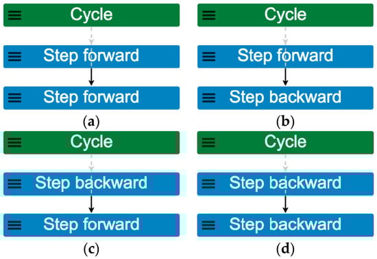 Outputs from the constrained Cycle_ISP_v1 model, run for scope 2: (a) Cycle steps forward twice (trace 1); (b) Cycle steps forward then backward (trace 2); (c) Cycle steps backward then forward (trace 3); (d) Cycle steps backward twice (trace 4).