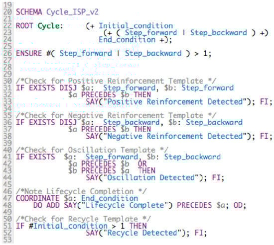 The model is further refined to explore additional possible cycle patterns. We added an initial condition prior to the repetition steps, and an end condition after the repetition steps. The initial and final conditions may also occur one or more (+…+) times. The entire Cycle_ISP_v2 model, along with annotation conditions (lines 30–53), is depicted in Figure 6.