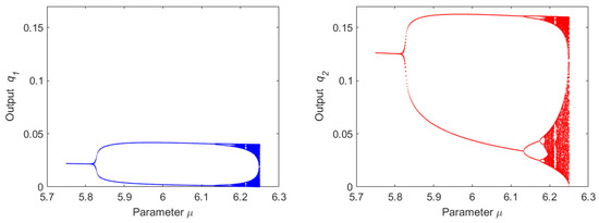 The bifurcation diagram of the map (23) with the inverse demand function (15), where and . The left diagram describes the dependence of the limit points of the variable on the parameter , and similarly, the right diagram describes the limit points of the variable Source: computation in MATLAB; cf. Appendix A.