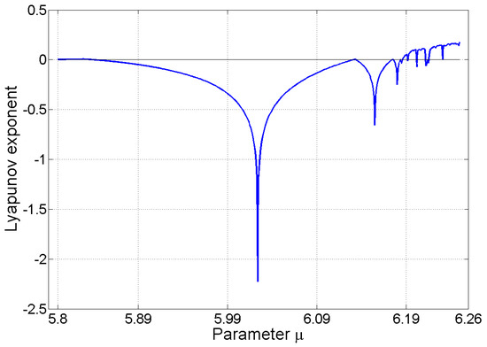 The bifurcation diagrams in Figure 1 provide only graphical evidence of chaotic behavior. To present quantitative evidence of this issue, Lyapunov exponents of the map (23) are computed here. The concept of Lyapunov exponents was introduced in Section 2.2. The described algorithm for the map (23) was implemented in MATLAB; see Appendix B. It was found that Lyapunov exponents for the bifurcation parameter can be approximated by the values and , respectively, after iterations. In this computation, the initial state and parameter were used. If the process of the computation of Lyapunov exponents converges, then it does not depend on the initial value This phenomenon was tested with different initial values. Since at least one value of Lyapunov exponents is positive, we can conclude that for the given value of the parameter , the map (23) is sensitive to the initial conditions. This means that it is possible to consider the fact that the given map shows features typical of deterministic chaos. The same computations can be used for different values of the bifurcation parameter In this way, the diagram of the largest Lyapunov exponent can be found. If , the diagram in Figure 2 can be constructed step by step.