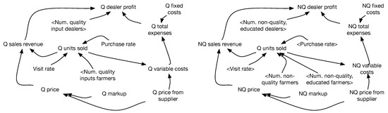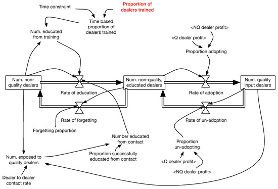 Thus, through these two steps, the overall movement from non-quality dealers to quality dealers is influenced by education through training, contact with successful quality dealers, and the potential profit. These are the three key factors that were identified in the system maps (described in Section 3.1) and in farmer surveys (see Section 3.4) as influencing this adoption decision.