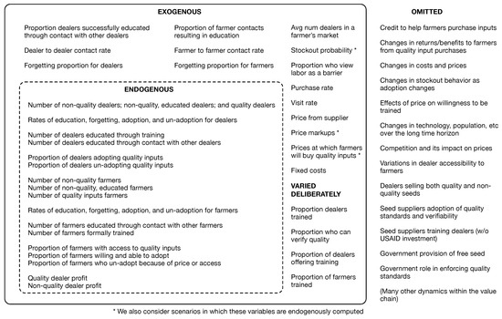 A number of potentially important dynamics were not included in this model, in order to focus on the most critical dynamics identified by our development partners (see the discussion of building a system map, in Section 3.1). Figure 4 provides a model-boundary diagram [30], which highlights which dynamics are endogenous, exogenous, and omitted from the model.