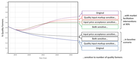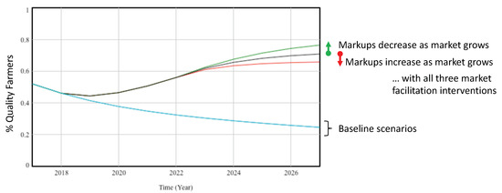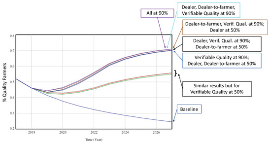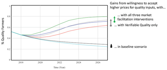A second omitted dynamic is the returns, or benefits, from investment in quality inputs, which are related to the price at which farmers sell their output. The current market rewards higher yields and some aspects of higher-quality outputs [31] with higher selling prices. The current model assumes that returns remain the same as they are in the current market because the rate of un-adoption is based on the rate at which farmers currently report un-adopting because of price (presumably because returns did not justify the additional investment). The output prices and farmer returns are unlikely to remain the same over the long term. Therefore, in Section 4.4, we examine how the results would change if output prices fall as the number of quality farmers grows. Our assessment, however, is not comprehensive, and future work should explore this issue, since our results indicate it is important.