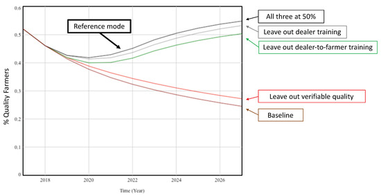 With the exception of verifiable quality, the individual interventions resulted in negligible increases in the overall percentage of quality farmers. While direct dealer training led to an early spike in the percentage of quality dealers, this advantage was not maintained in the long run and had little effect on farmer adoption. These scenarios follow the same decreasing trend as the baseline.
