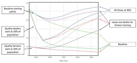 The baseline scenario leads to a continuing decrease in the percentage of farmers choosing quality inputs. At baseline levels, the system does not change in the desired direction: toward widespread farmer and dealer adoption. The declining baseline is most likely the result of very low adoption rates, due to the significant barriers to adoption that farmers face (access to seed from nearby dealers, stockouts, labor, and price), combined with a somewhat higher un-adoption rate, due to price and access.