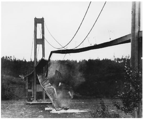 - Gaal, R. This Month in Physics History, November 7, 1940: Collapse of the Tacoma Narrows Bridge. APS News. November 2016, Volume 25. Number 10. Available online: https://www.aps.org/publications/apsnews/201611/physicshistory.cfm (accessed on 14 August 2018).