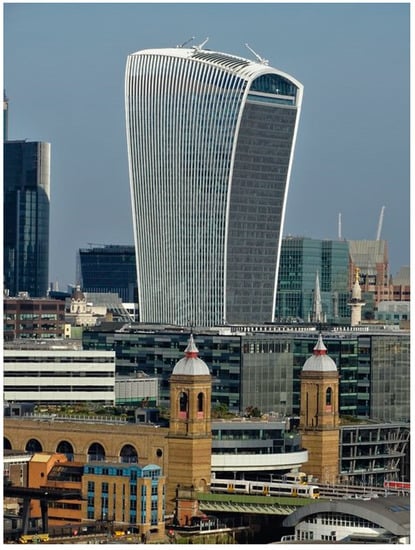 - Sherwin, A. Walkie Talkie City Skyscraper Renamed Walkie Scorchie after Beam of Light Melts Jaguar Car Parked Beneath It. The Independent. 3 September 2013. Available online: https://www.independent.co.uk/arts-entertainment/architecture/walkie-talkie-city-skyscraper-renamed-walkie-scorchie-after-beam-of-light-melts-jaguar-car-parked-8794970.html (accessed on 7 May 2018).