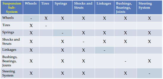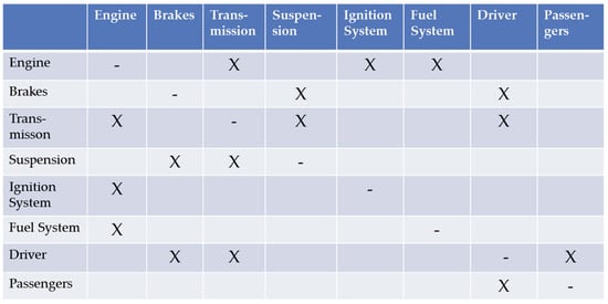 One of the best tools for identifying planned and unplanned relationships among system components and among system and environment components is the System Interrelationship Matrix or SIM. One constructs the SIM by listing all system and environmental components on both axes of a two-dimensional matrix, as shown in Figure 7. Then, one places an X in every cell representing an interaction between the components. One may add detail by noting (in addition to the X) the type of interaction: for example, command-control, mechanical, chemical, emotional/psychological, organizational, frictional. One may make a single matrix for the entire suprasystem, or one may develop smaller, more tractable SIMs for sub-levels or components, as shown in Figure 8 for automobile components.