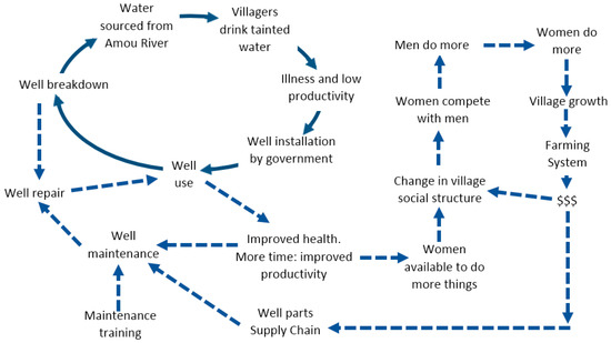 The Water of Ayolé. The Water of Ayolé demonstrates that few engineering/technical issues are exclusively technical; most involve support infrastructures, people, the environment, economics, and other factors. Ayolé is a small rural village in the West African country of Togo. In the 1970s–80s, the water source for the village was the Amou River, which happened to be infested with the guinea worm Dracunculus medinensis, a parasite that infects a human host and causes excruciating pain. To address this issue, government and international aid organizations dug and installed wells in the village, which worked well for several years. However, as the wells broke down (due to normal wear and tear), no spare parts were available, no technical expertise was available to fix or maintain the pumps, and no money was available to pay for repairs. After three years, the people of Ayolé were back to using the contaminated water from the river. The government engineers had interpreted this as a purely technical/engineering problem, when in fact it was much broader. To their credit, the local Togolese extension agents applied Systems Thinking to address the larger systemic issues. They trained some of the villagers in well maintenance and repair; they established a repair parts supply chain via the local Togo hardware store; and the women of the village structured an agricultural product production and sales system to generate money to pay for the parts. What was thought to be a simple engineering problem turned out to be an engineering/socio-economic/logistics/psychological problem.
