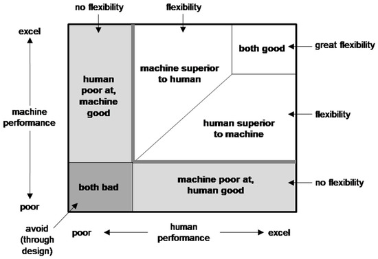 An erroneous assumption that is often made is that machines are good at tasks that humans are poor at, and vice versa. This is an incorrect assumption because there are tasks that both can do well (e.g., option selection) and there are tasks that neither does well (e.g., rapid estimation/assessment of risks). This recognition brings us to define six task performance regimes: (1) machines excel at, but humans are poor at; (2) humans excel at, but machines are poor at; (3) humans and machine (automation) can both perform well; (4) neither does well, and therefore should be avoided through proper system design; (5) machines have an advantage over humans; and (6) humans have an advantage over machines [33]. Figure 2 presents these different regimes in an easy-to-understand, compact representation.