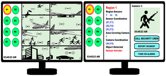 When a region’s color code turns red, the user clicks on that region’s icon to acquire detailed information. The right monitor provides detailed information on sensors, motion, location, cameras, etc. The actions that the commander (user) can take include calling in a security crew, turning on alarms, reporting the incident to higher headquarters, etc.