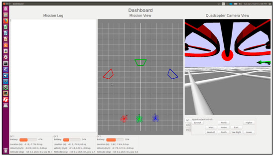 Figure 6 shows a prototype dashboard implementation for multi-quadcopter management. This dashboard in this prototype shows three quadcopters, which are tasked with collaboratively pursuing a mission. Each quadcopter can be launched independently. The dashboard provides a plan view showing the progress of the three quadcopters toward their goal. When the user selects a quadcopter icon, the dashboard provides a camera view for the selected quadcopter, along with the status information for that quadcopter in terms of location, battery level, etc. The human (agent) can intervene and redirect one or all quadcopters. The dashboard maintains an audit trail for each quadcopter and the quadcopter team. The dashboard is implemented in Python. It employs a Mavlink protocol to communicate with a simulated or real quadcopter. The communication is identical for both simulated and real quadcopters [1,2].