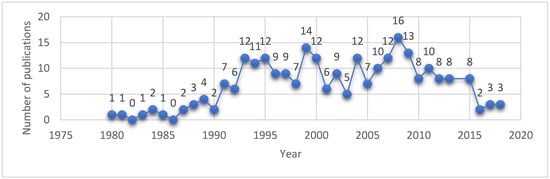 The first major outcome is the publication trend tied to soft systems methodology from 1980 to 2018 as we approach 40 years of SSM discussion and use. Since this research approach was meant to take a global view of SSM’s impact on academic output, we did not discriminate by region, instead choosing to view academic impact as an aggregate, worldwide outcome. Figure 1 presents the number of publications that included some reference to SSM (1980–2018).