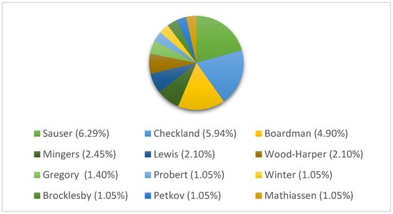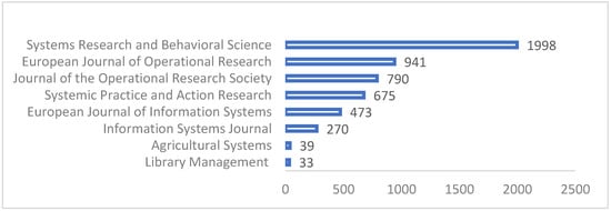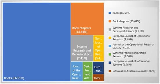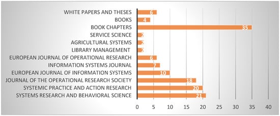 For SSM as a topic of discourse and use as a research method, Figure 4 visualizes the high impact of four books and thirty-five book chapters had versus journals. 11,144 total book citations came from Checkland’s and Scholes’ 1990 book [26], which gave that publication the largest impact on other authors. Removing that text as an outlier, SSM-related books still had almost twice the citation impact of book chapters and nearly a treble impact over the top journal’s pieces, limiting the impact of academic research pieces that employed SSM by comparison.