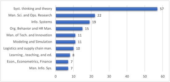 “Systems thinking and systems theory” constituted the largest subject, with “Management science and operations management” trailing considerably. This was, in part, because our content analysis revealed that most pieces coded as systems thinking and systems theory discussed the development of SSM from the perspective of a discipline, but often contained no research application. Most also only described proposed alterations of the methodology for a particular purpose [27] (e.g., software development by adding UML) or a description of SSM to a new audience [28,29] (e.g., marketing, medical settings, etc.) and failed to provide evidence of their effectiveness. The Scimago codes above were classified into broad subject categories based on the topics of the articles in the database and are presented in Figure 6.