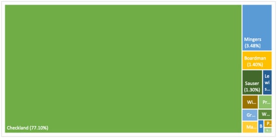 The top six authors combine to represent 23.78%, or nearly a quarter of all SSM-related publications since 1981. The remaining 75% of pieces written by other authors indicates a broad distribution of the ideas and application of SSM, with those above serving as what Lave and Wenger [30] called core participants in what may be considered Community of Practice centered on the development and use of soft systems methodology for academic research and theory development. While the distribution of the work is fairly broad, the following Figure 8 shows that the citation impact is substantially different.