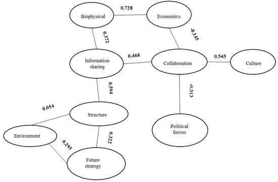 According to the SE (Table 2), Hypothesis 4, 7 and 9 were large, while Hypothesis 1, 5, 6 and 10 were categorised as medium. Hypothesis 2 was classified as trivial. This research, however, uses the SE only as a guide. Hence, it does not view Hypothesis 2 as insubstantial. According to the SE, the strategy-environment and the collaboration–economics average effect sizes were classified as small. A stronger correlation increases the predictive worth of an interaction hence, is the case for Hypothesis 4, 7 and 9. This implies that the knowledge of either factor can be used to predict the behaviour of the other. Referring to Figure 1, information sharing is seen to be more predictive of structure compared to collaboration and the biophysical domain . Based on the potency of the interlinkages it is recommended that in cases where information sharing is viewed as a constraint, decision-makers should comprehensively consider the role of structure, collaboration and then the biophysical domain, respectively.