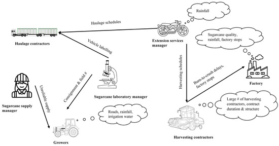 The rich picture was well received at the meeting as participants approved its contents and further advised on other issues that were not captured by the earlier interviews. Besides understanding what was being portrayed by the rich picture, some of the stakeholders made fun of how they were represented on the picture. The sugarcane laboratory manager jokingly stated that “I can see myself under the microscope” whilst the sugarcane supply manager wondered “why are we represented by helmets”. It was suggested after much deliberation that machine breakdown should be considered for further investigation. In a sugarcane mill, machine breakdowns are often associated with excessive soil and foreign matter. There is often an increase in foreign matter with rainfall. Accordingly, Moor posited that high mud levels often choke the shredder machine [129]. Machine breakdown in the factory could, therefore, be analysed along the different modes of failure, rainfall and maintenance. It is also important to determine how and at what speed the breakdown information is communicated between stakeholders. This is critical because machine breakdowns have a ripple effect both up and downstream. The biophysical domain is interlinked to economic issues (Figure 1); hence, consideration of the economic impact of breakdowns on the system could provide some direction.